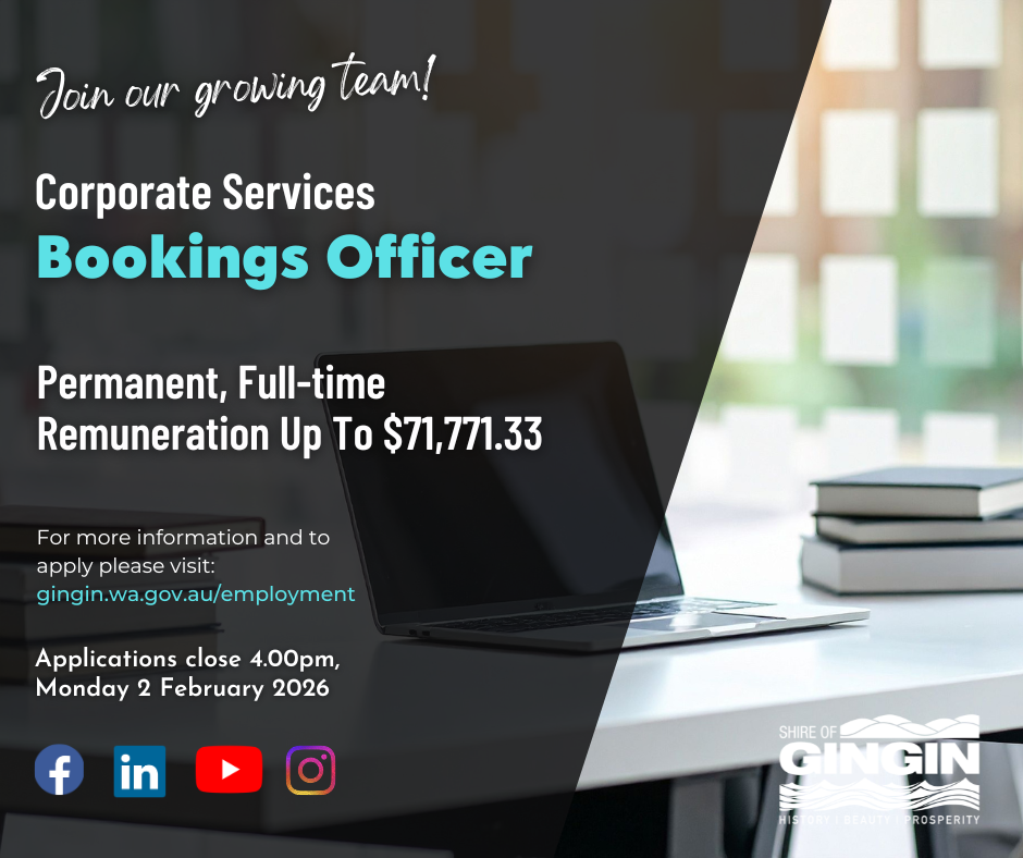 The Shire of Gingin is seeking a customer-focused Bookings Officer to provide outstanding service to community members/groups, organisations and businesses booking our facilities and services. This role plays a key part in creating positive experiences by ensuring bookings are handled efficiently, accurately, and professionally.