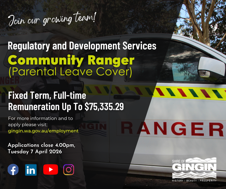 The Shire of Gingin is seeking a proactive Ranger to help protect our community’s safety, amenity, and environment. This role is responsible for enforcing a range of legislation, including the Dog Act 1976, Cat Act 2011, Bush Fires Act 1954, Control of Vehicles (Off-Road Areas) Act 1978, Litter Act 1979, Local Government Act 1995, Local Government (Miscellaneous Provisions) Act 1960, Caravan Parks and Camping Grounds Act 1995, and Council Local Laws to ensure the Shire remains a safe and enjoyable place for residents and visitors alike.