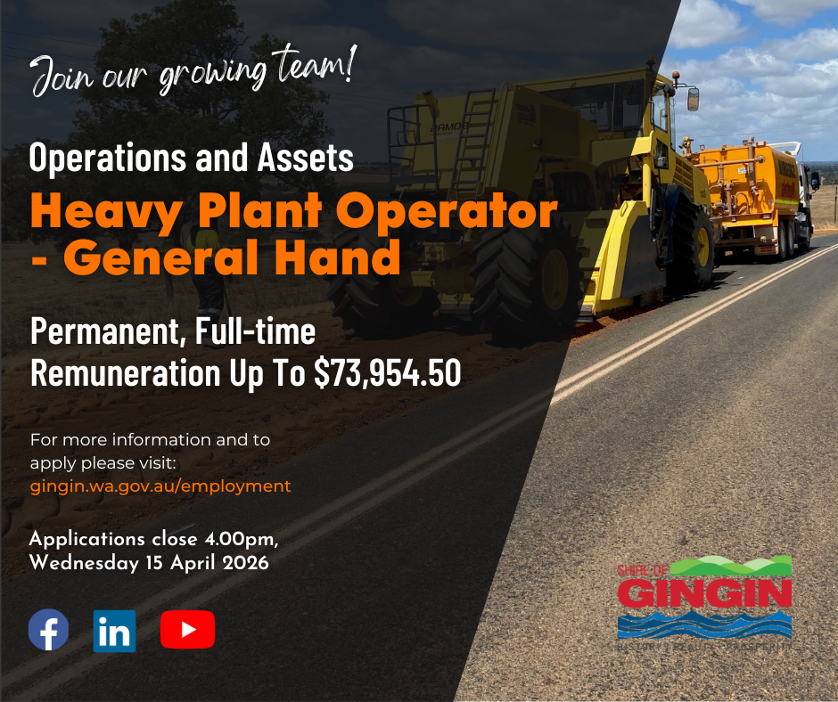 The Shire of Gingin is seeking a reliable and skilled operator to assist with the construction and maintenance of our road network and infrastructure. This position may be required to undertake general duties, if required and/or as directed, by the Road Maintenance Leading Hand, Road Construction Leading Hand, Technical Coordinators, Administrative Coordinator and/or Executive Manager Operations and Assets.