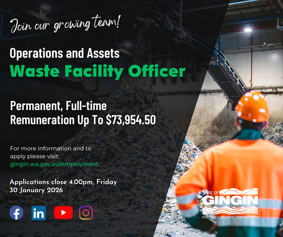 The Shire of Gingin is seeking a dedicated Waste Facility Officer to support the day-to-day operation of our waste facilities. This role applies specialist operational knowledge to ensure waste services are delivered safely, efficiently, and in compliance with approved management plans and regulatory requirements.