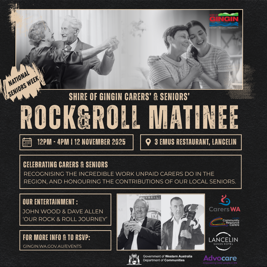 The Shire of Gingin has combined Carers Week (12 - 18 October) and Seniors Week (9 - 16 November) for one big ROCKING celebration!