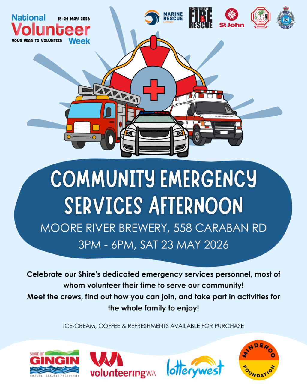 Thank you to Lancelin Marine Rescue, Gingin Volunteer Fire & Rescue, St John WA - Lancelin , Gingin DHS and Gingin Police for supporting the Shire in this project. Thanks also to the Shire of Gingin Volunteer Bush Fire Brigades and Gingin Red Cross for participating.