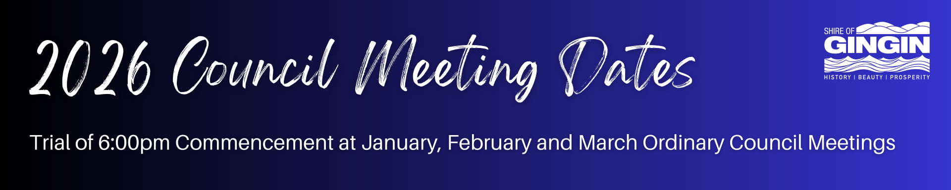 This means that the 2026 January, February, and March OCMs will commence at 6:00pm instead of 3:00pm. The venue for these meetings has not changed and will remain at Council Chambers in the Shire’s Gingin Administration Centre, 7 Brockman Street, Gingin.