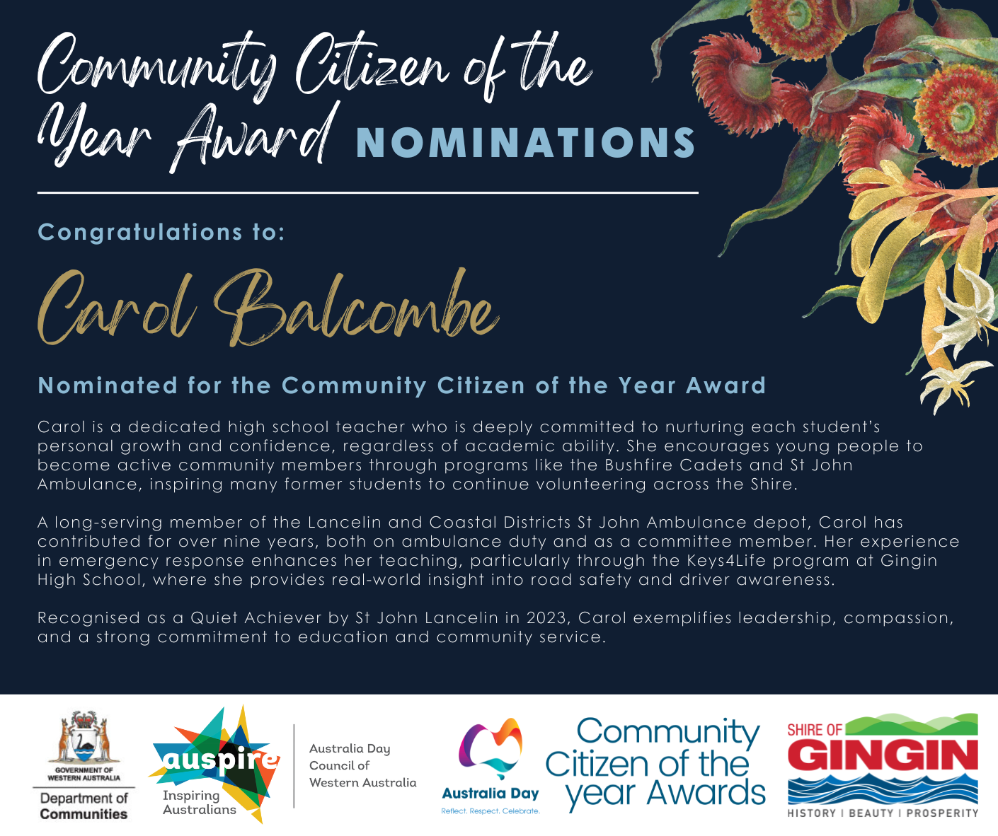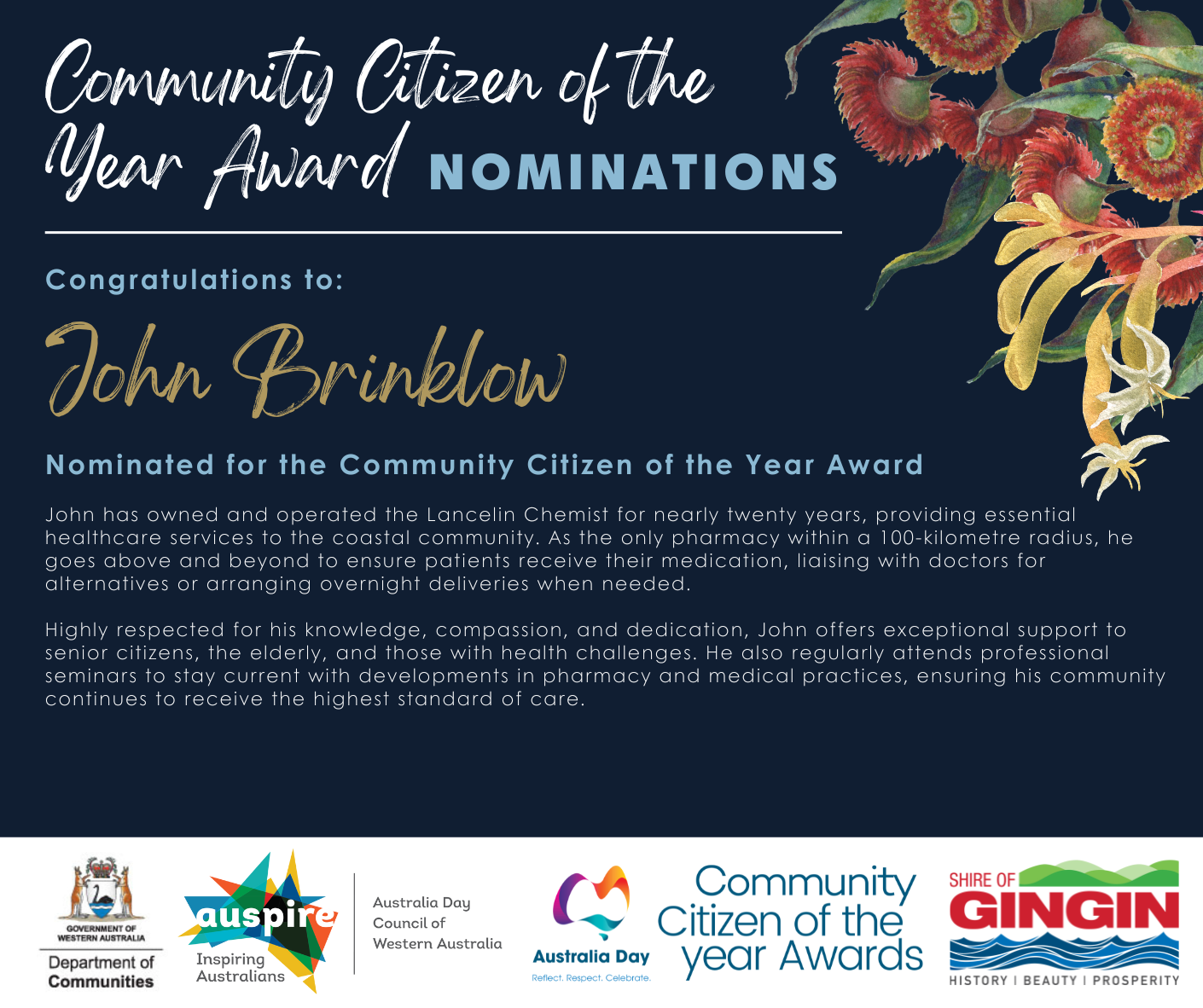 This year, we had 19 nominations across the four categories. In the Community Citizen of the Year Category, we had 7 nominations. Congratulations to the following nominees: