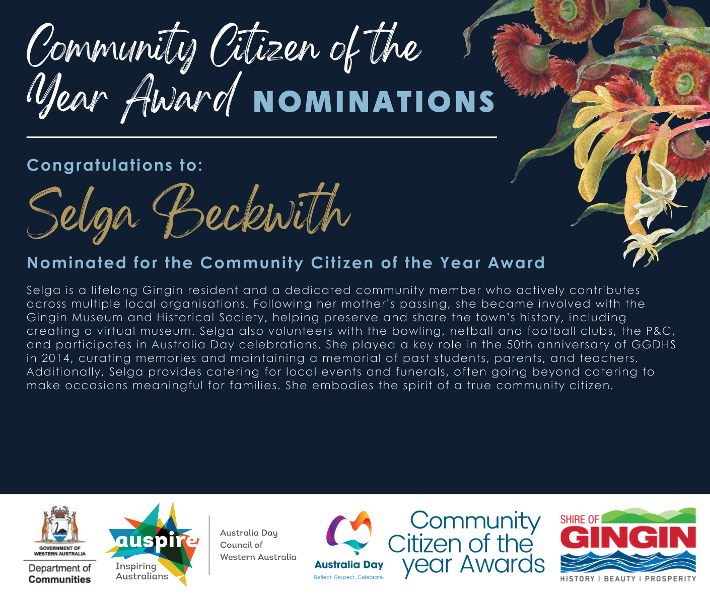 The winner will be announced at the Australia Day Neergabby Breakfast Ceremony on Monday 26 January at the Neergabby Community Grounds.