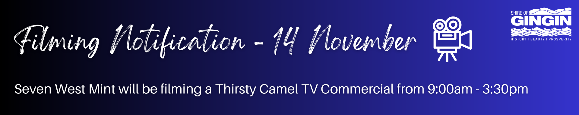 in and around the Gingin townsite tomorrow from 9:00am - 3:30pm filming a TV commercial for Thirsty Camel.