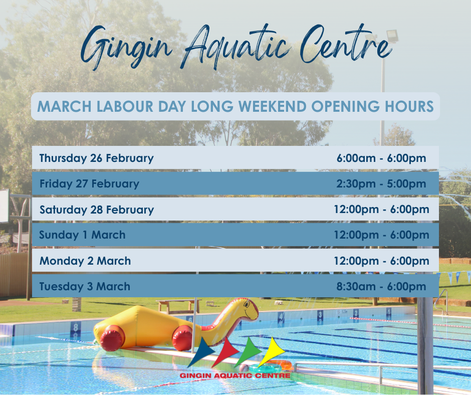 Please be advised, the Gingin Aquatic Centre will have altered opening hours over the March Labour Day Long Weekend, please see below the altered hours: