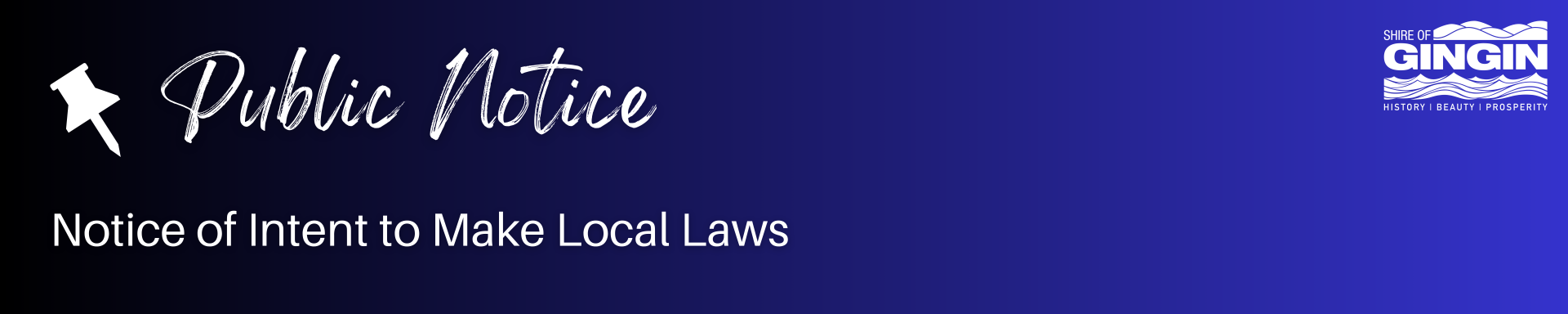 Members of the public are invited to make written submissions in relation to the following proposed local laws. Submissions will be accepted up until 4.30pm on Monday, 15 December 2025. Submissions must be addressed to the CEO and can be emailed to mail@gingin.wa.gov.au or posted to the Shire of Gingin, PO Box 510, Gingin WA 6503.