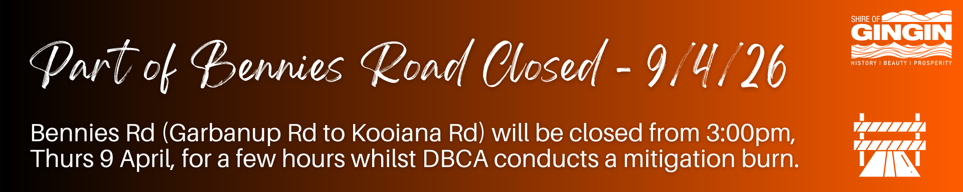 DBCA will be conducting a mitigation burn on State Forest on Thursday, 9 April 2026 at approximately 3:00pm. Due to the narrow road, Bennies Rd will be closed between Garbanup Rd and Kooiana Rd for a few hours to support community safety.