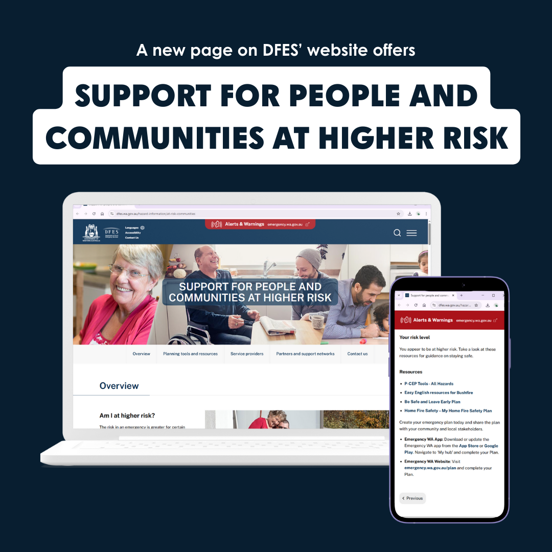 Department of Fire and Emergency Services WA have launched a new page to support people and communities who are at a higher risk during an emergency. This page is designed for people who face additional challenges, including (but not limited to):