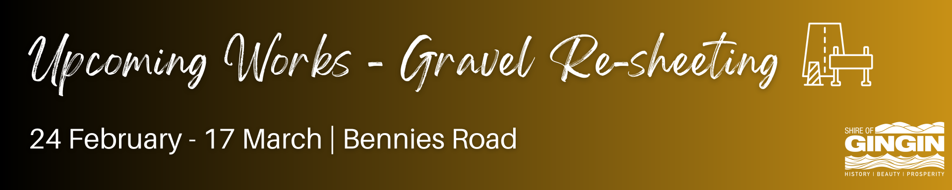 Please be advised, on Tuesday 24 February we will commence gravel re-sheeting on Bennies Road as part of our Capital Works Programs. These works are expected to take 2-3 weeks to complete.